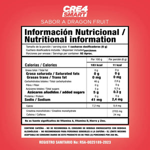 CRE4 SMART es una mezcla en polvo con sabor a dragon fruit, reúne tres ingredientes premium que marcan la diferencia. Su fórmula combina creatina monohidratada ultra pura, cafeína anhidra de calidad controlada y AstraGin®, un extracto patentado que optimiza la absorción de nutrientes. Cada ingrediente ha sido seleccionado por su respaldo científico, pureza y funcionalidad.