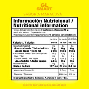 GL SMART es una mezcla en polvo sabor maracuyá que combina 6 g de L-glutamina pura por porción junto con una mezcla de electrolitos esenciales que favorecen la hidratación y el balance mineral después del ejercicio. Diseñada para quienes prefieren una bebida ligera, sin azúcar añadida y con buen perfil de solubilidad.
