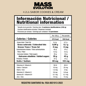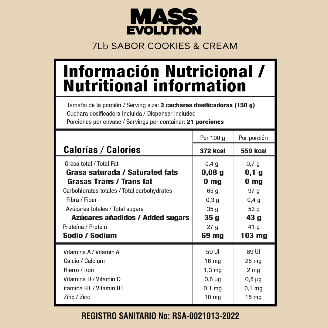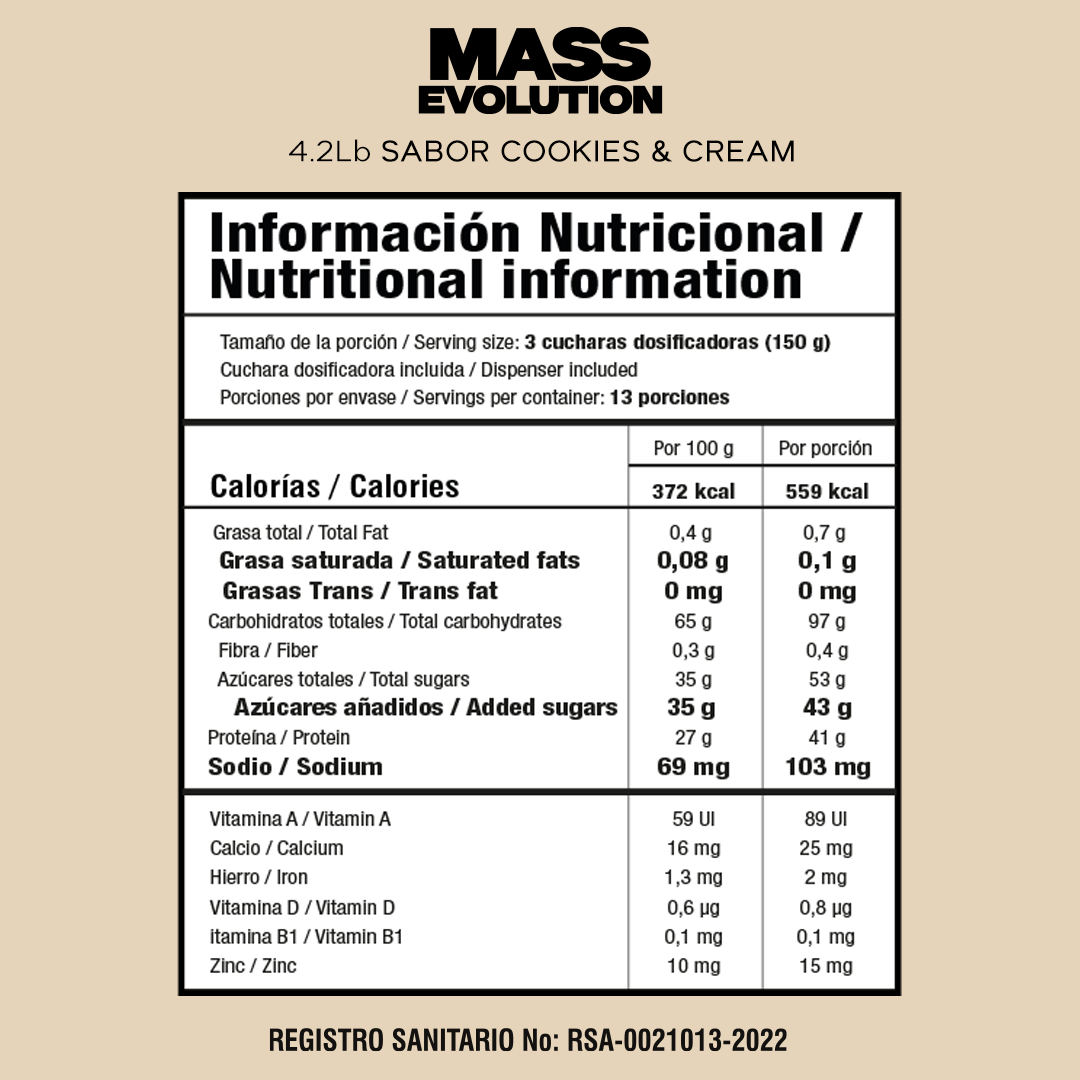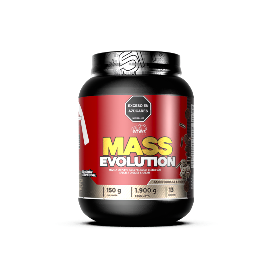 Mass Evolution es una mezcla en polvo con sabor a Cookies n Cream, desarrollada para quienes se encuentran en una etapa de volumen o necesitan complementar su alimentación con un alto aporte calórico y proteico.