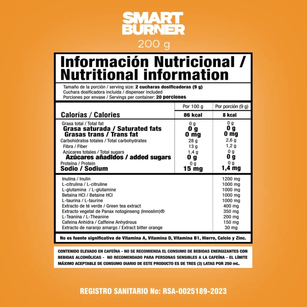 SMART BURNER es una mezcla en polvo sabor durazno, desarrollada con una combinación avanzada de ingredientes funcionales, extractos botánicos y aminoácidos como inulina, L-Citrulina, té verde, cafeína e InnoSlim®, un ingrediente vegetal patentado con respaldo científico.